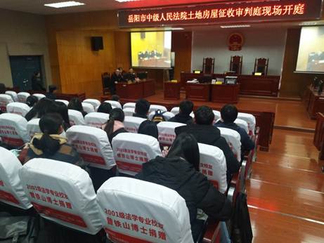 为了开阔学生的视野,扩充学生的专业知识,加大法学专业实训教学力度;同时,也为了进一步强化广大师生学习、生活和工作中的遵法、守法、懂法、用法意识,3月20日上午,岳阳市中级人民法院土地房屋征收审判庭首次将某房屋征折系列案件庭审搬至该院驻湖南理工学院“第六数字法庭”,即政法学院模拟法庭现场开庭,15级法学专业学生以及部分专业老师参与了旁听。