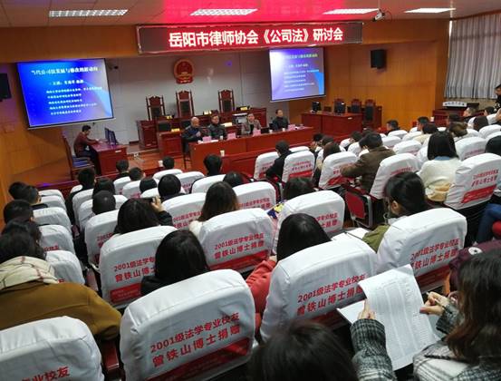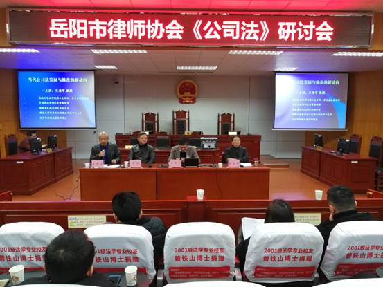 12月17日上午九点,由湖南理工学院政法学院、岳阳市律师协会、湖南弘一(岳阳)律师事务所联合主办的《公司法》研讨会在我院模拟法庭举行。会议邀请湖南大学法学院肖海军教授担任主讲,著名商法学与经济法学专家刘定华教授、西南政法大学经济法研究中心研究员李剑博士担任评议人。岳阳市50多位律师与我院法学专业部分学生共200余人参加了本次研讨会。