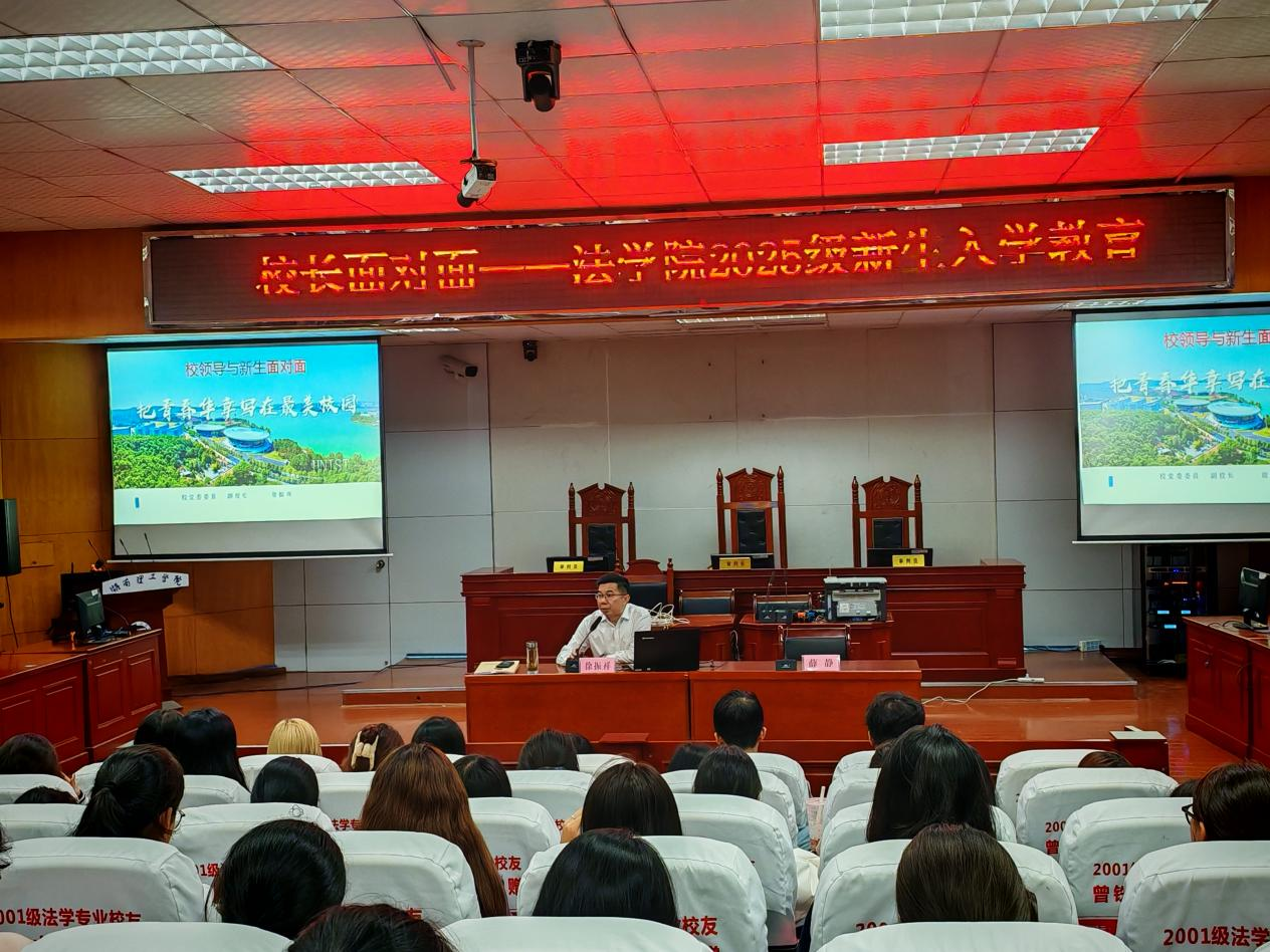 为帮助2025级新生更快适应大学生活、坚定理想信念、明确奋斗目标,10月14日,法学院在8栋模拟法庭开展“校长面对面”入学教育专场讲座。湖南理工学院党委委员、副校长徐振祥以“把青春华章写在最美校园”为主题,从校训内涵、校园建设、学科发展、校史传承等维度,与法学院2025级全体新生进行面对面交流。法学院党委书记薛静主持讲座。
