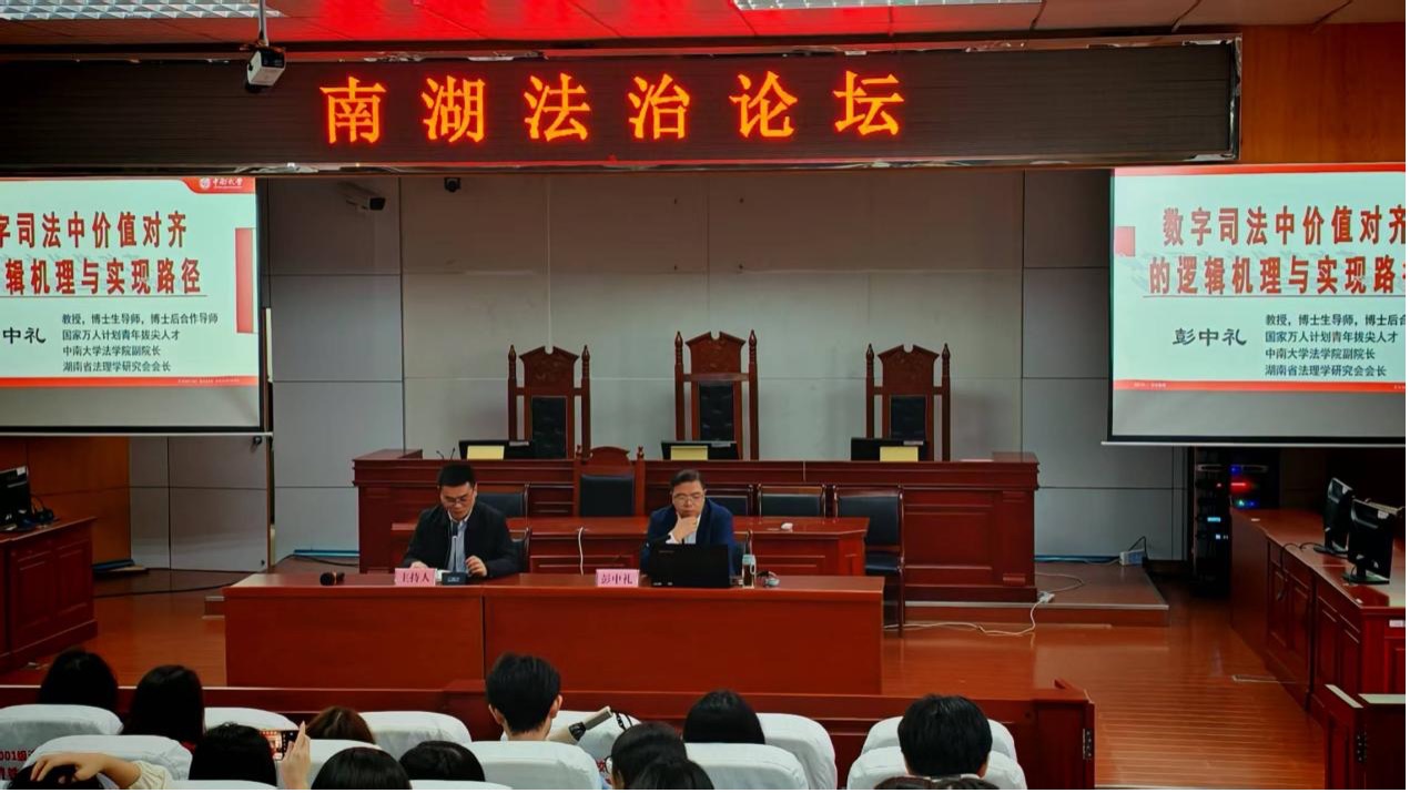 为深入探究数字司法领域的前沿理论与实践难题,助力知识产权专业学子精准把握数字司法发展趋势,10月30日,法学院主办的“南湖法治论坛”在模拟法庭如期举行。中南大学法学院副院长、湖南省法理学研究会会长彭中礼教授应邀主讲,以“数字司法中价值对齐的逻辑机理与实现路径”为主题开展学术讲座。本次讲座由彭江辉院长主持,法学院2023级、2024级知识产权专业全体学生参会。