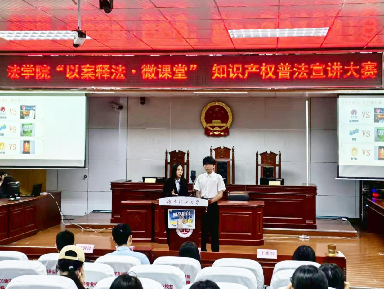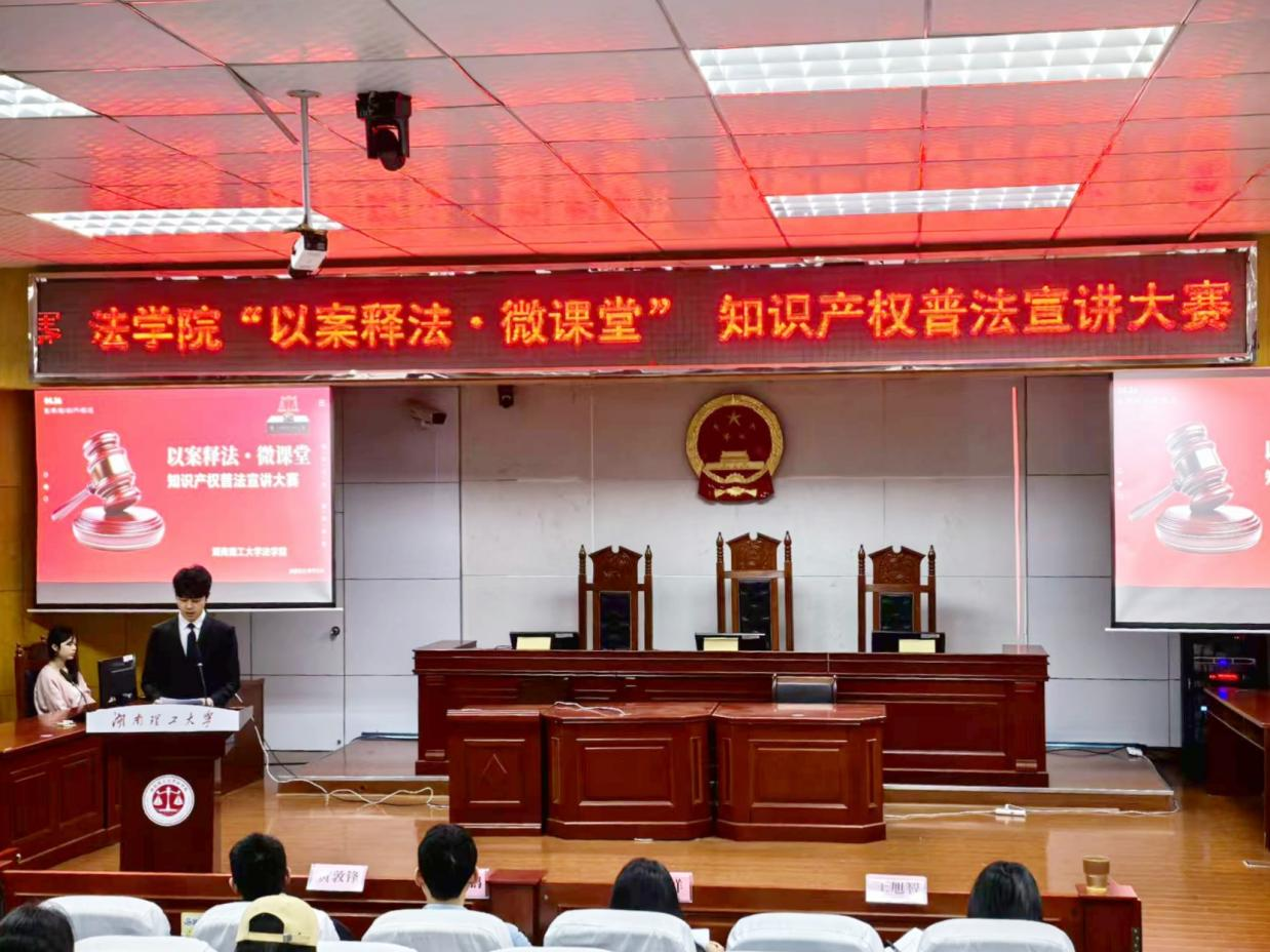 为迎接第26个世界知识产权日(4月26日),进一步强化青年学子知识产权保护意识,营造尊重创新、崇尚法治的校园氛围,4月20日下午,法学院于模拟法庭成功举办“以案释法·微课堂”知识产权普法宣讲大赛。岳阳市知识产权保护协会副会长兼秘书长黄敦锋、岳阳市律师协会知识产权专委会副主任胡祥、湖南理工大学法学院知识产权博士王学鹏、2025级辅导员王旭智担任本次大赛评委,全体参赛选手及24知产、25知产班全体学生现场观摩比赛。