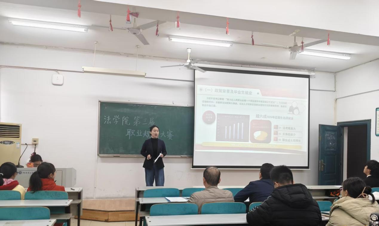 比赛现场气氛热烈,选手们沉着自信,结合精心准备的PPT,从自我认知、环境分析、目标设定、发展前景等多个维度全面且深入阐释了职业规划蓝图。他们或逻辑严密,条分缕析;或视野开阔,富有洞见,充分展现了法学学子严谨的思辨能力、流畅的表达能力以及对未来职业发展的深入思考。