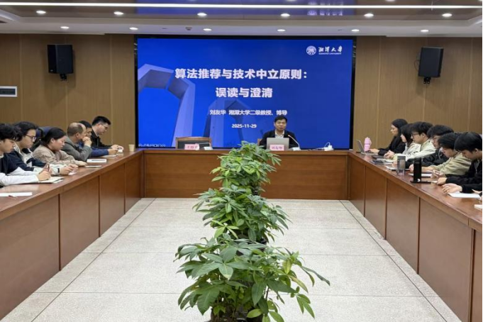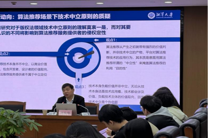 为深入探究数字时代算法技术的法律边界与责任界定,助力法学专业学子精准把握数字技术前沿研究法律问题,11月29日,湘潭大学博士生导师、知识产权领域知名学者刘友华教授应邀主讲,以“算法推荐与技术中立原则:误读与澄清”为主题在我院开展学术讲座。本次讲座由彭江辉院长主持,法学院2024级、2025级研究生积极参会。