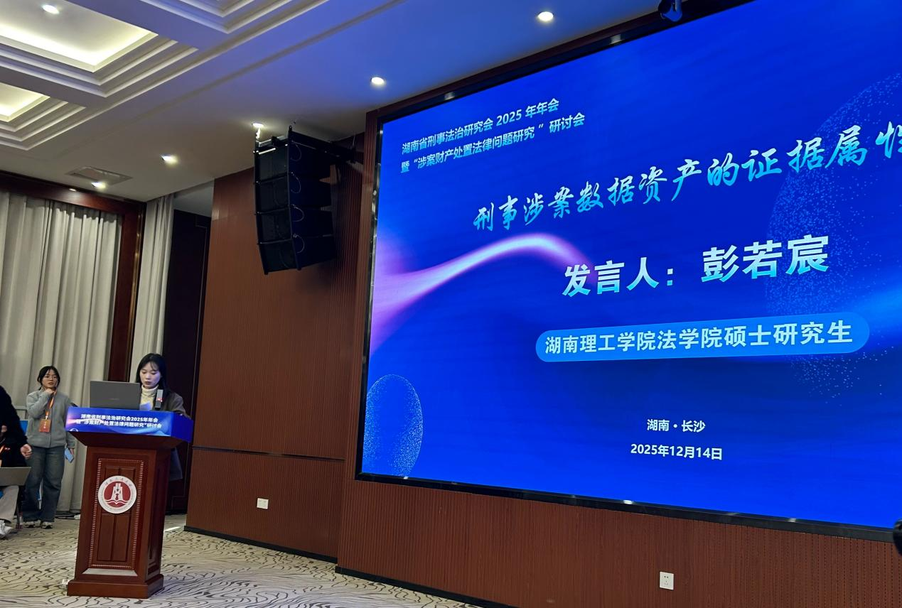 2025年12月14日,湖南省刑事法治研究会2025年年会在长沙召开,会议由湖南省刑事法治研究会主办,湖南工商大学法学院(纪检监察学院)承办。我院张咏涛副教授、尹晓闻副教授和研究生彭若宸、卢翔、王曦悦等同学受邀参加本次会议。本次年会的研讨主题为“涉案财产处置法律问题”,与会专家学者从“涉案财产追缴、退赔处置的实体问题”“涉案财产追缴、退赔处置的程序问题”“涉案虚拟财产的处置问题”等方向展开探讨,并从212篇年会投稿论文中遴选出34篇文章作者作为主题发言人发言。