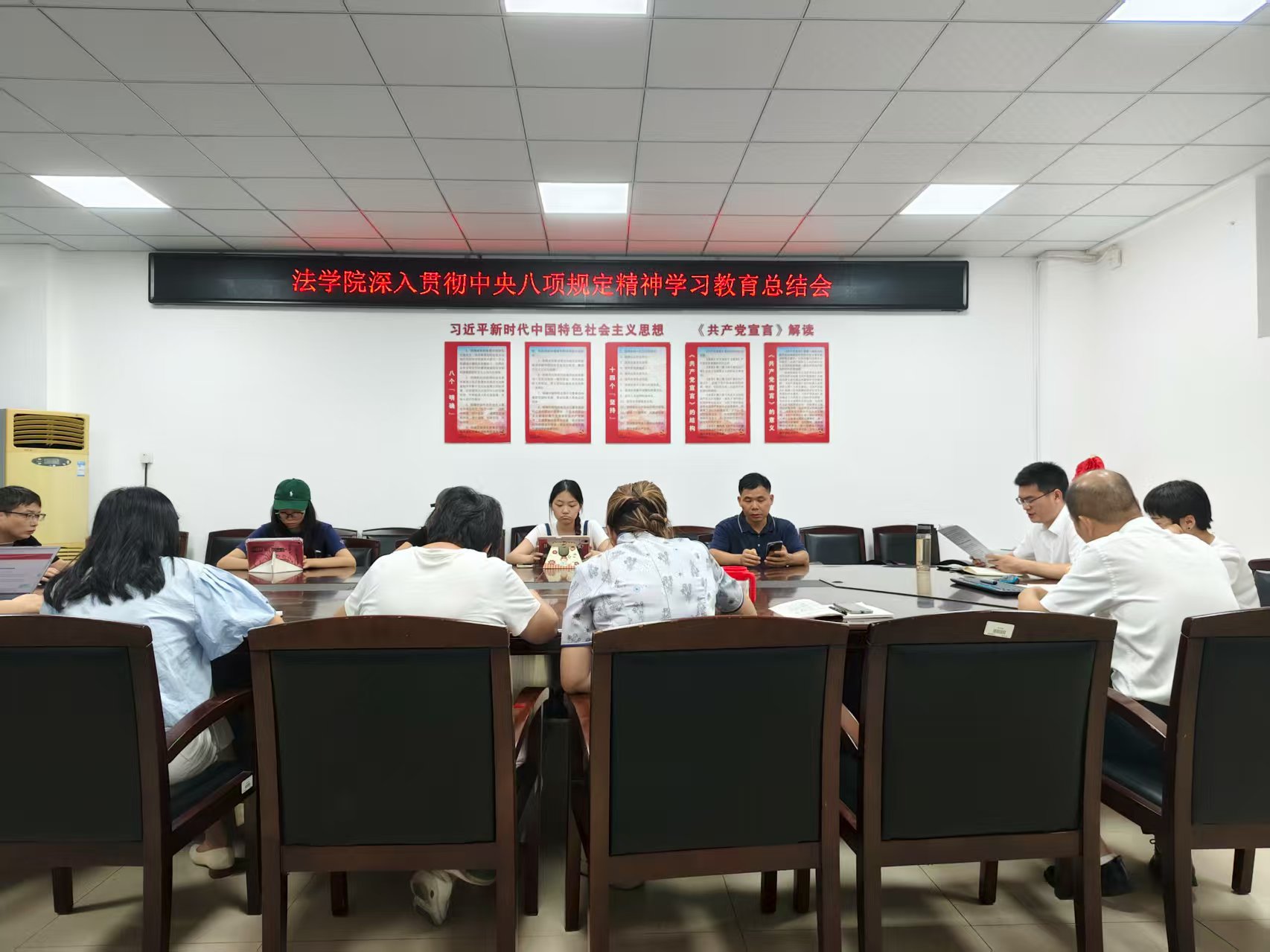 【本站讯】为深入学习贯彻习近平总书记重要指示精神,巩固拓展学习教育成果,推进作风建设常态化长效化,9月15日下午15:30于8栋学院会议室,法学院召开深入贯彻中央八项规定精神学习教育总结会。法学院党委班子成员、各支部支委与部分党员代表参加会议。