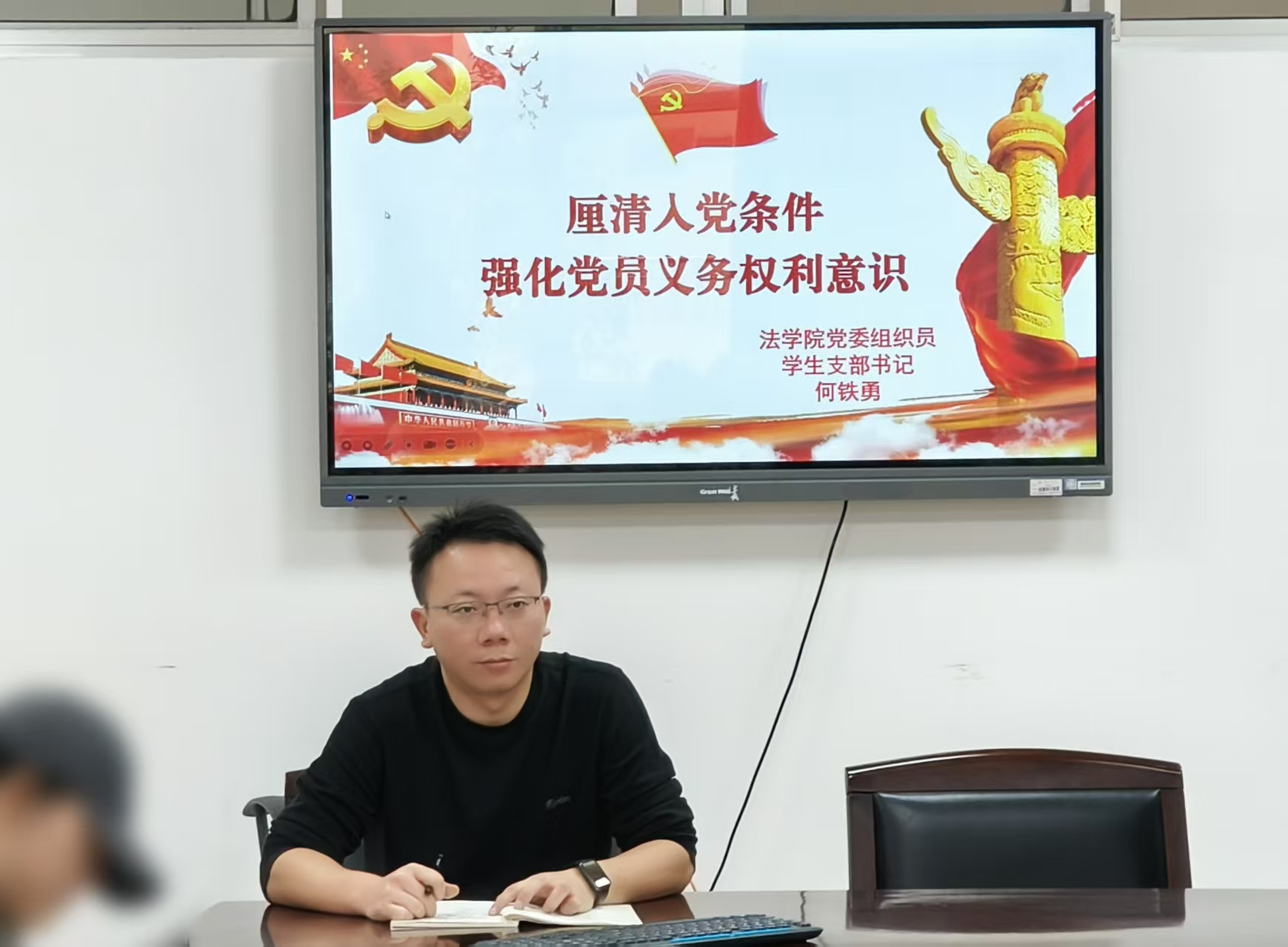 【本站讯】为助力入党积极分子全面了解入党条件,增强向党组织靠拢的信心,11月4日14:30于八栋会议室,法学院党委组织员、学生党支部书记何铁勇为第53期入党积极分子讲授党课。第53期入党积极分子共42人全体参加。