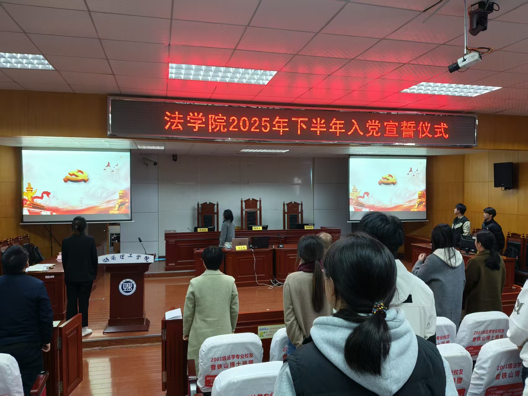 【本站讯】为学习贯彻党的二十届四中全会精神,进一步教育引导新党员铭记入党初心,11月25日14:00于模拟法庭,法学院召开2025年下半年入党宣誓仪式。法学院党委书记薛静、党委副书记张陈武出席仪式。法学院全体师生党员、入党积极分子参加。